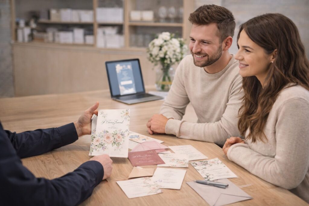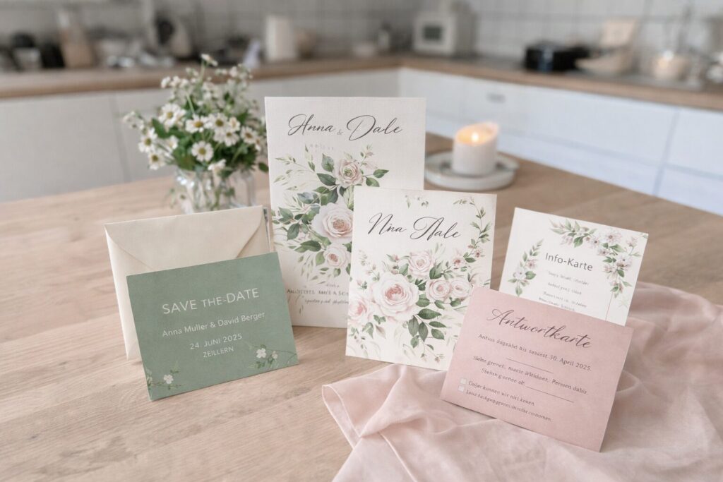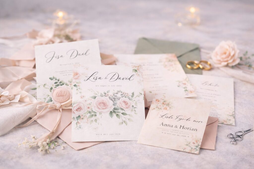 Wir gestalten Einladungskarten, Menükarten und Papeterie, die euren Stil widerspiegeln – persönlich betreut, hochwertig gedruckt und perfekt abgestimmt.